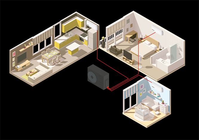 iekštelpu iekārtas var pievienot vienai ārējai vienībai. Ideāli piemērota